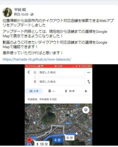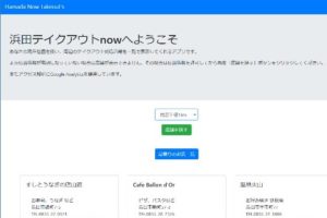 他にも、位置情報を使って近くの浜田市内の飲食店を探すこともできたりします。観光で訪れた人向けに展開すると面白いんじゃないかなと思います。実際に浜田市内のテイクアウト対応店を位置情報から探してくれるものを作ったりもしました。⇒浜田市テイクアウト店アプリ