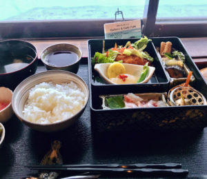 (写真左:2階カウンター席からの眺めは絶景  写真右:おまかせ御膳1,000円)