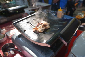 (草野さん)コンロの上に瓦を敷いて直接お肉を焼く直火焼耐熱瓦というものに惹かれました。最初は瓦で焼くの?と思いましたが、火も通り、ちょうど瓦の溝に油がたまるようなのでいいアイデアだと関心しました。瓦という和の要素にシックなデザインで洋のテイストも加えるすばらしい技術にも脱帽しました。また、浜田応援団の記事でも紹介されていた瓦箸置きをはじめお皿やコップなども温かみがありましたね。亀谷さんの瓦食器は、東京では見られない昔懐かしい浜田の赤い屋根の風景を思い出し、神楽坂にも雰囲気がぴったりだなと感じました。