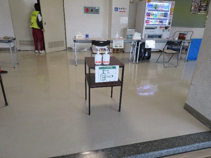 (写真左:試合開始前から会場準備 写真右:会場入口で感染防止対策を徹底)