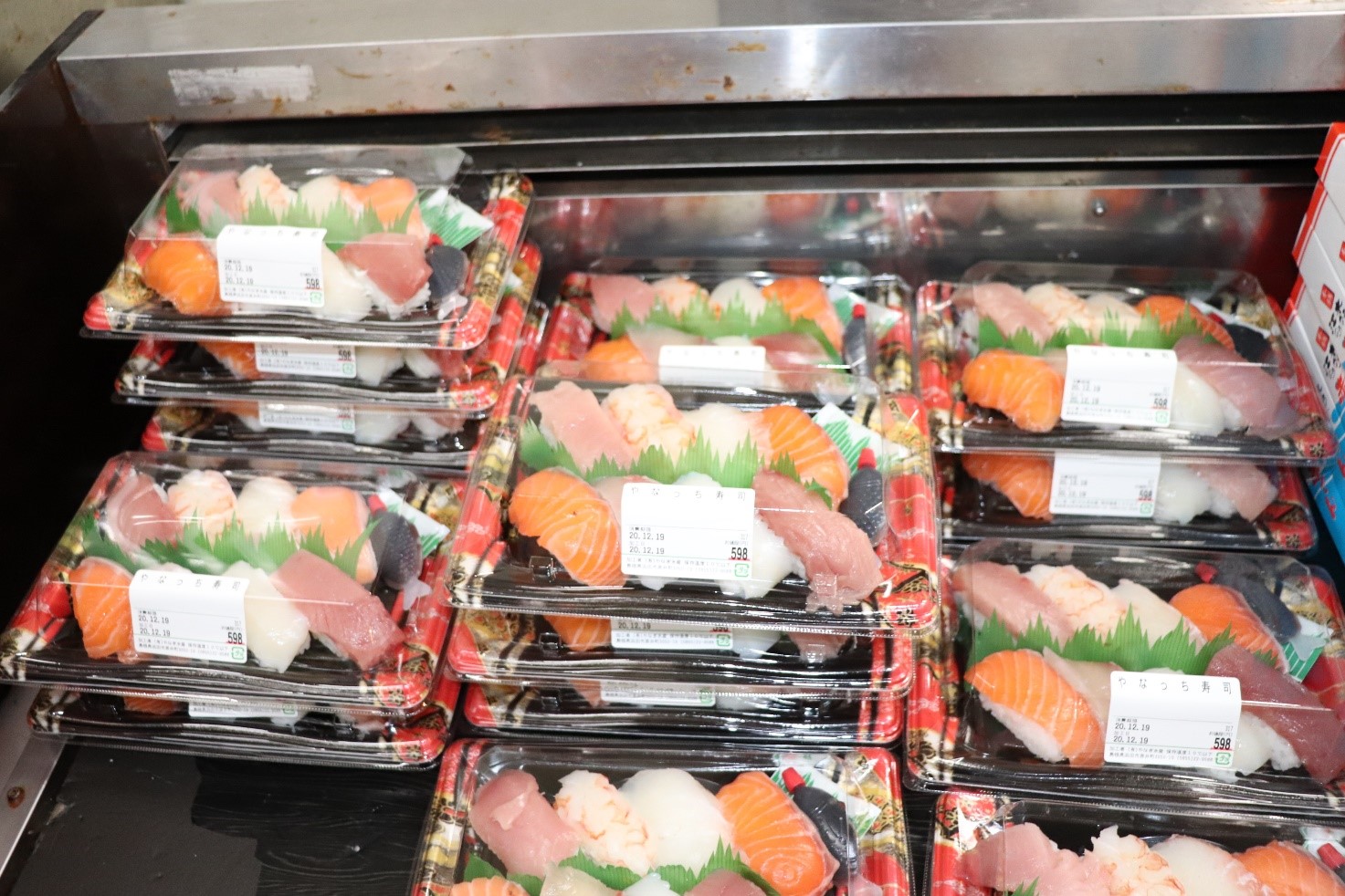 (写真左:握り寿司のコーナー 写真右:レジ前はお昼まで途切れることなく行列が続いていた)