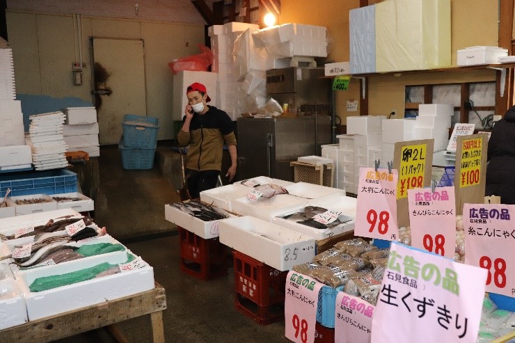 ‐朝市を覗いてみました。活気ある店内にはたくさんのお客さんであふれていましたね。