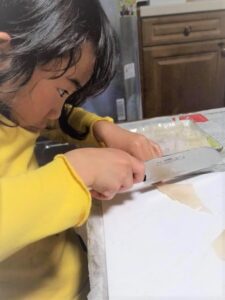 イカは包丁を使う場面も少ないですし、ニュルっとした感触もおもしろいので、お子さまにはとっても良い題材だったように思います。