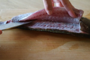 炙りもおいしいと伺っていたのですが、バーナーをお持ちの方も少ないでしょうし、このレッスンは「特別な道具は揃える必要はなく、家にあるもので捌く」という裏テーマのようなものもあります。なるべく魚捌きのハードルを上げないように、常に心がけています。
