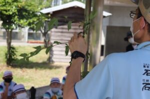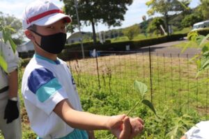 (酒井さん)草抜きが終わるといよいよ芽かきです。最初は戸惑いながら芽かきをしていた児童も、後半は余裕が出たのか楽しみながら作業していました。