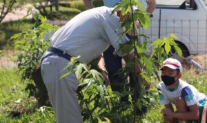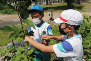 (酒井さん)草抜きが終わるといよいよ芽かきです。最初は戸惑いながら芽かきをしていた児童も、後半は余裕が出たのか楽しみながら作業していました。