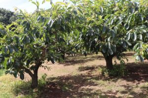 (三浦さん)柿を大きく育てるのには、摘果(てきか)という作業がとても重要です。摘果は、7月上旬~7月下旬に行うのですが、大きくて美味しい柿が実るように小さい柿の実や奇形果を間引きします。だいたい10㎝間隔で1つの果実を残すとよいよ。