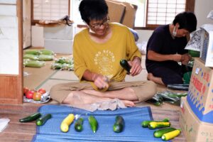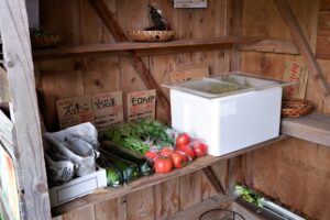 (武元さん)季節に合わせてできる野菜を作っています。今の時期(7月中旬)はトウモロコシとズッキーニが旬ですね。最近はズッキーニが次から次へとできるので、毎朝5時から収穫しています。獲れた野菜は市内の飲食店などに配達したり、自宅前の直売所にて無人販売をしています。さらに、90羽のニワトリを飼っていまして、産みたての卵を“めでたまご”と名付け販売しています。