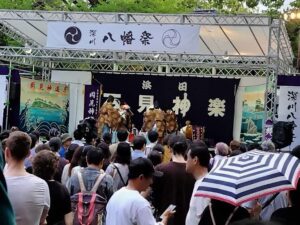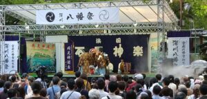 8月13日、日枝神社の山王祭や、神田明神の神田祭を並ぶ、深川八幡例大祭が6年ぶりに開催され、石見神楽が上演されました。