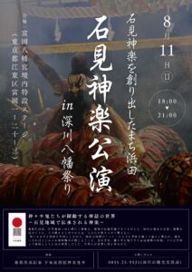 令和6年8月11日(日)東京都江東区の富岡八幡宮で「深川八幡祭」にて、石見神楽の上演と観光PRを行います。