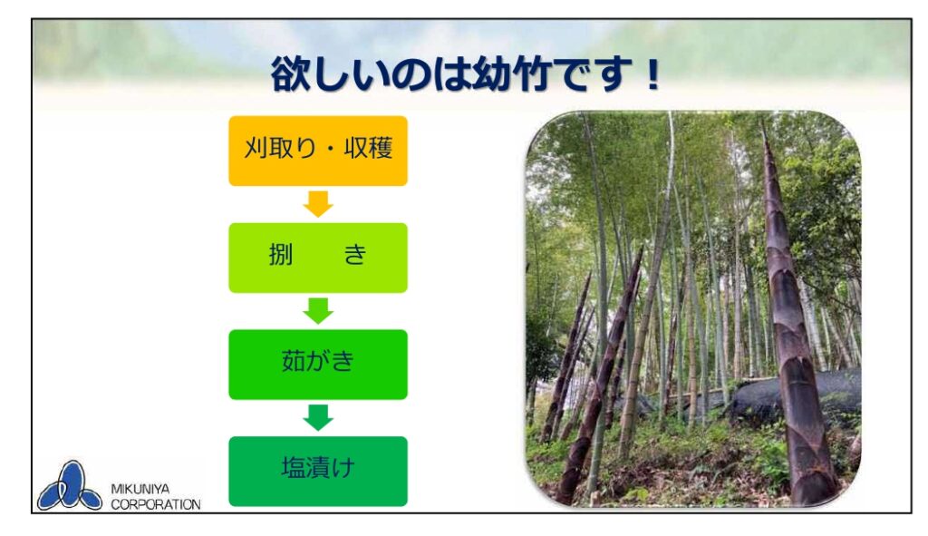 – 幼竹を加工して塩漬け処理まで行ったもの