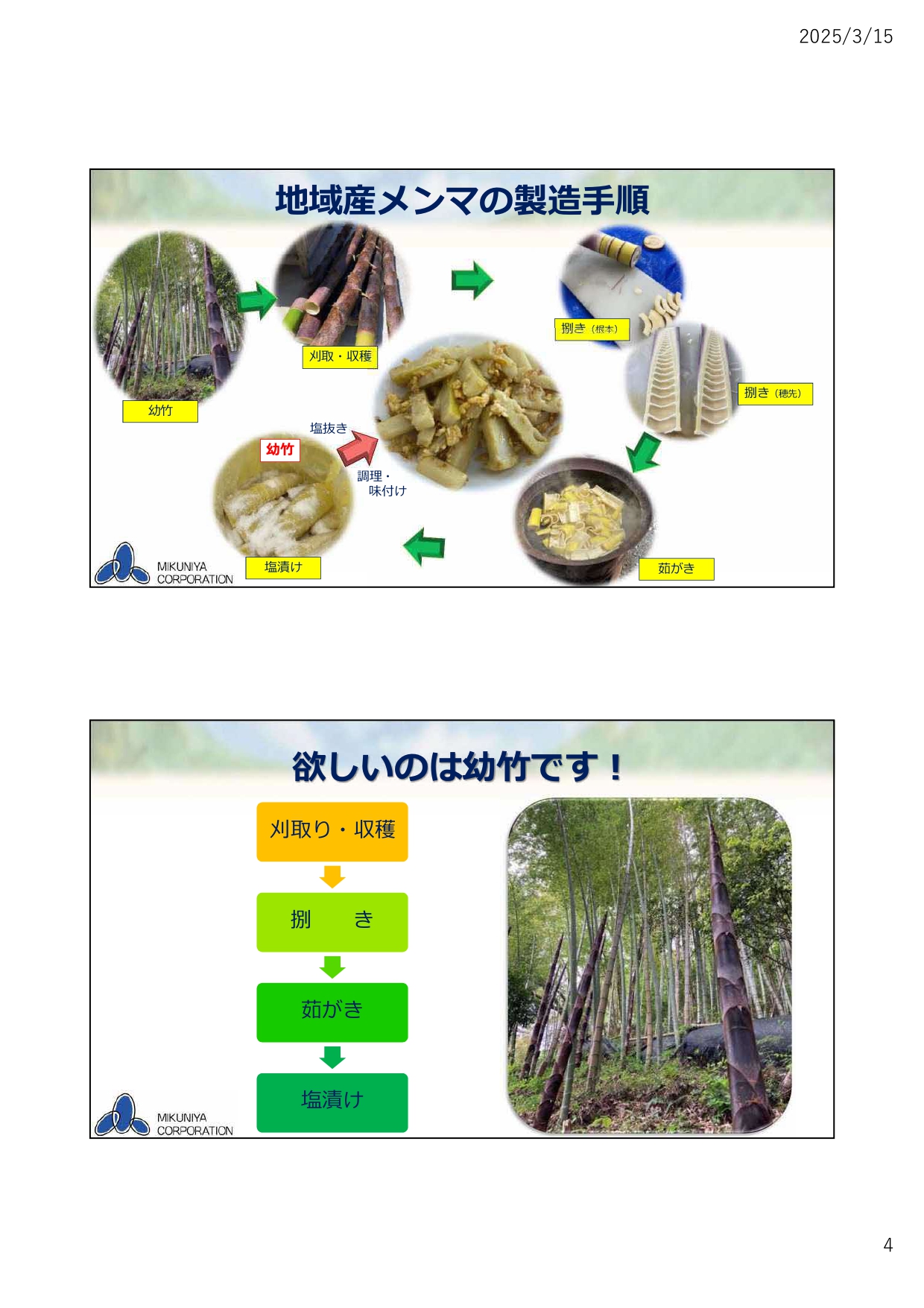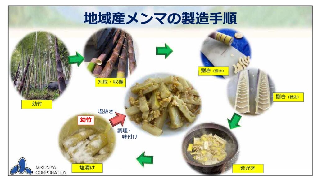 日本ミクニヤ株式会社あさひひまわり工房さんは、『純国産メンマプロジェクト』のメンバーで浜田市内の竹林でとれる幼竹を使って竹菜を作る取り組みをされています。